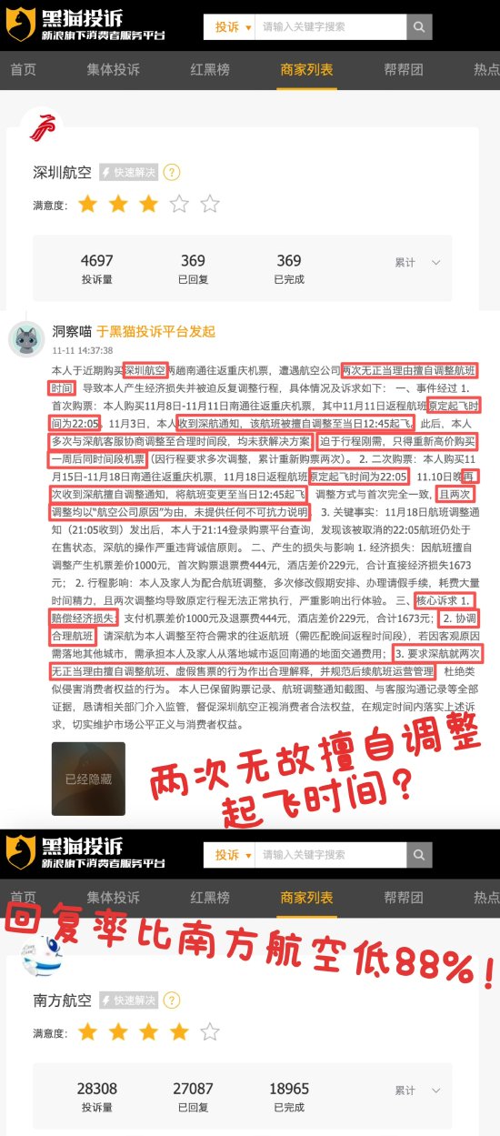 近期,有消费者向黑猫投诉 【下载黑猫投诉客户端】反馈,自己购买深圳航空机票后收到航司通知原定22:05起飞的航班被调整至12:45起飞,且未告知正当理由。与航司沟通无果后,因行程安排原因,消费者只能重新高价购买一周后同时间段机票,却在出发前再次被航司通知被调整至12:45起飞,仍是未提供不可抗力说明,仅以“航空公司原因”为由。对消费者因此产生的经济损失及行程影响,航司不提供任何赔偿。截至目前,深圳航空在黑猫投诉平台投诉累计达4697单,回复率仅为7.86%配资吧,比南方航空低88%。